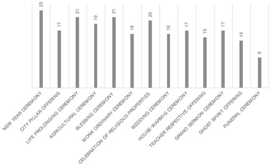The data in Figure 7 underscore the significant role that flowers and plant species play in Lanna cultural and ceremonial practices in Chiang Mai Old City. The study identified 67 plant species used across 13 different rituals, demonstrating the deep integration of floral elements into various aspects of community life. Notably, the New Year Ceremony has the highest usage of plant species, with 23 different types symbolizing renewal and blessings. Ceremonies such as the City Pillar Offering, Life Prolonging Ceremony, Agricultural Ceremony, and Blessing Ceremony each involve many plant species, reflecting their cultural importance and the community’s connection to nature.