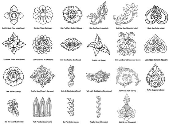 Lanna floral motifs, commonly found in religious architecture in Northern Thailand, symbolize a profound link between local beliefs and the surrounding natural world. These intricate floral designs not only serve as decorative elements but also hold substantial cultural and spiritual significance, reflecting the community’s deep respect for nature and its incorporation into spiritual customs. Lanna art forms, such as Flora patterns, showcase the importance of these motifs in the cultural heritage, emphasizing the preservation and promotion of Lanna artistic traditions. Furthermore, tourism development guidelines proposed for the Lanna region underscore the value of architectural heritage in attracting visitors and enhancing cultural tourism experiences, emphasizing the need for improvements in accessibility and infrastructure to further showcase these cultural treasures. In a comprehensive survey of 38 temples in Chiang Mai Old City, researchers identified an impressive 61,790 pieces of floral motifs. These motifs were meticulously categorized into 23 distinct types, illustrating the diversity and richness of the Lanna artistic tradition (Figure 8).
