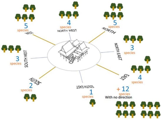 The traditional belief of the Lanna people is that human beings are an integral part of nature and should live in harmony with it, recognizing and valuing each other’s existence. They use wisdom to adapt to the various conditions of their natural surroundings. To study plants according to Lanna beliefs, important and relevant documents were reviewed, resulting in the classification of plants into 12 groups. These groups are organized into eight compass directions and four special categories: specific plant species for a front yard, plants for positive omens, plants for magic suppression, and plants with negative omens (Figure 9).