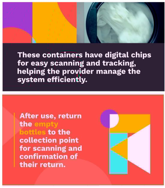 Participants completed an online survey hosted by Qualtrics (Qualtrics, Provo, UT, USA). After reading an information sheet and giving consent, they were presented with a scenario that asked them to imagine buying laundry detergent in a supermarket. They were told that some products, such as laundry detergent, are packaged in reusable plastic containers with digital chips that allow the containers to be scanned (e.g., at the point of purchase, cleaning facility, etc.), which helps the provider manage the system (e.g., know how many containers are waiting to be filled, are with customers). Participants were asked to imagine using this scheme, including that they would need to return the empty bottles to the collection point on their next shopping visit so that the bottles could be cleaned and refilled, ready to be used again. Alongside reading the scenario, participants also had the opportunity to watch a short video that illustrated how the digital reuse system would work (see Figure 2 for screenshots).