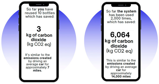 Participants were presented with four metrics: (i) plastic consumption (i.e., number of bottles saved), (ii) energy saved (MJ), (iii) water consumption (m3), and (iv) carbon (kg CO2 equivalent) to highlight the environmental impact. These values were estimated following lifecycle analysis conducted by the TRACE project team (https://gtr.ukri.org/projects?ref=10015760 (accessed on 1 July 2024)) and presented through a simulated app interface. The presentation was designed to mimic receiving real-time notifications on an app and included information on equivalent actions (e.g., that 66 MJ of energy is similar to that used by a desktop computer over 8 days) to facilitate interpretation of the information.