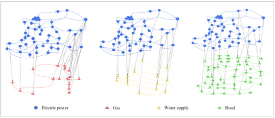 This study employs a topology-based network model to simulate the process of post-disaster failure propagation and the recovery of interdependent CISs, as shown in Figure 1. This model, proposed by Johansson and Hassel [35], aimed to capture the geographical and functional interdependencies between railways, traction power, telecommunications, auxiliary power, and power supply systems in a fictional railway network. It can capture the topological characteristics of interdependent CISs, and the constructed structure can effectively reflect the functionality of CISs. Moreover, compared to other modeling methods, this method only requires a small amount of data, including the topological structure. Currently, this network model has been widely applied in CIS modeling and simulation, including its use for power supply systems [49,50], water supply networks [7,12], gas systems [51], and railway systems [52].