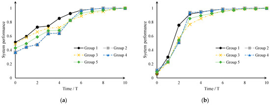Results of recovery in CISs for different disaster scenarios and evaluation groups. (a) Scenario 1; (b) Scenario 2.