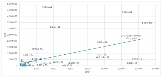 Figure 1 illustrates the main sectors/regions that contribute to CO2 emissions. The trend line is an average of efficiency by sector and region in Chile. Above the line it pollutes more than the average, and below the line it pollutes less than the average. Certain activities contribute significantly to the GDP of the territory, such as mining (s02) in Norte Grande, which has high CO2 emissions in this territory. Sturla-Zerene [61] has conducted research in Chile on greenhouse gas emissions from the mining industry and how they affect sustainability in the context of copper mining. An interesting finding from this study is that improving the sea transport network for Chilean copper exports can contribute significantly to the emission reduction.