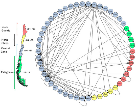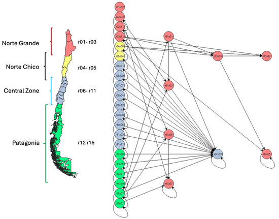 Figure 2 shows that there are two regions and their economic activities within the territory located in the Norte Chico facilitate their development with small modifications (r04s12 and r05s02). In the first example, the public administration sector (s12) and the Atacama region (r04) are based on the results of r10s02 and r07s02. It is relevant to keep in mind that the population of Norte Chico is significantly smaller than that of Norte Grande, which depends on government activities. Furthermore, this type of territory based its growth on the same activities and functions that the Chilean government is in charge of; this also occurs in the extreme regions of southern Chile, such as Patagonia [77].