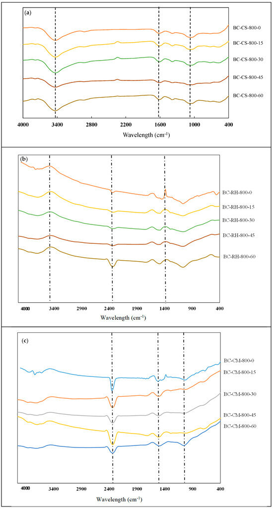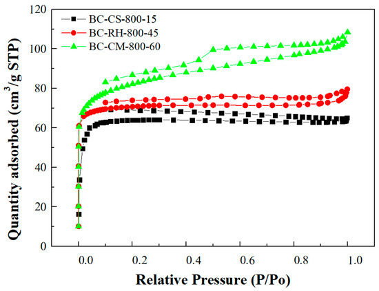 - Nitrogen adsorption–desorption isotherms indicated that these biochars exhibit Type I and IV isotherms, characteristic of microporous and mesoporous structures, with BC-CM demonstrating the highest adsorption capacity.
