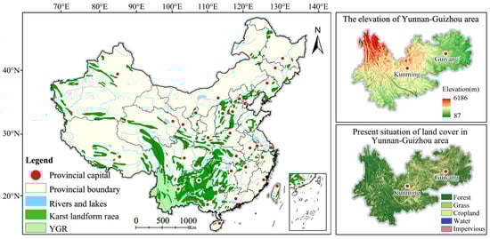 The YGR is located in southwestern China, encompassing 25 prefectures in Yunnan and Guizhou provinces, with a total area of approximately 570,000 square kilometers (Figure 1). It is one of China’s four major plateaus and contains one of the world’s three highest concentrations of karst landscapes [29]. Positioned at the junction of continental plates, YGR is influenced by the collision and compression of the Indian Ocean plate and the Eurasian plate, resulting in rugged terrain overall. As an important ecological barrier in southwestern China, the region is crisscrossed with rivers and abundant in precipitation, with rainfall concentrated during the rainy season and often coming in heavy downpours. However, due to its unique karst landscape and geological conditions, the ecological environment in this area is extremely fragile, with severe issues of soil erosion and land desertification [30]. YGR is a key focus area for China’s “Western Development Strategy” and the “Two Horizontal and Three Vertical” strategy, as well as an important node in advancing the One Belt One Road initiative. In 2010, the urbanization level in the YGR was only 34.26%, with a regional GDP of USD 16.28 billion, accounting for approximately 2.94% of the national GDP. By 2022, the urbanization level had increased by nearly 20% to reach 53.27%, with a regional GDP of USD 676.86 billion, accounting for 4.06% of the national GDP. The rapid development of urbanization has placed tremendous pressure on the fragile ecological environment of YGR, making the safeguarding of regional ECS a key and challenging step in effectively enhancing the quality of developing urbanization in the region.