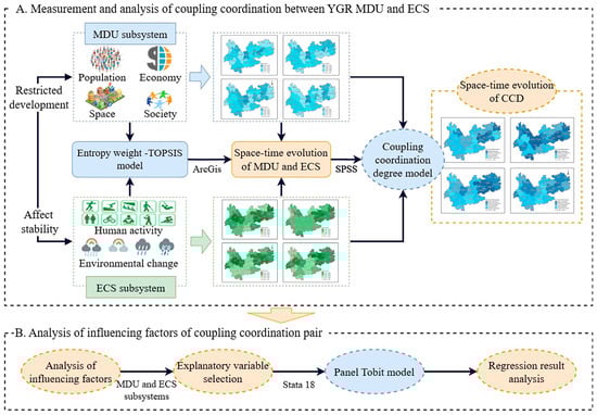 As shown in Figure 2, the main research content of this study includes two parts: the analysis of the degree of coupling coordination (CCD) between MDU and ECS and the study of their influencing factors.