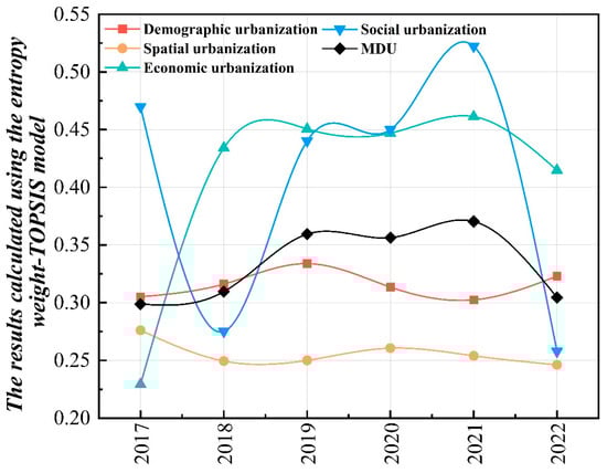 Based on the results of the entropy weight–TOPSIS model (Figure 3), from 2017 to 2022, the YGR’s MDU remained at a low level and developed slowly, increasing only from 0.299 to 0.305. Economic urbanization and demographic urbanization show a fluctuating upward trend, while social urbanization and spatial urbanization exhibit a fluctuating downward trend. The YGR’s MDU development leans more towards the transition from a rural to an urban population and urban economic growth rather than the enhancement of urban facilities and spatial expansion. This is mainly due to the YGR’s development policies, which encourage rapid urban population growth and economic growth through a series of “catch-up” strategies. Looking at the changes in primary indicators, the growth of demographic urbanization (from 0.305 to 0.323) contrasts with the slowed development of spatial urbanization (decreasing from 0.276 to 0.246). This highlights common challenges in areas with karst terrain, where land suitable for urban development is limited and infrastructure construction is difficult. The rise in economic urbanization (from 0.229 to 0.415), compared to the decline in social urbanization (from 0.450 to 0.258), underscores that the YGR’s economic growth has yet to effectively promote simultaneous improvements in urban facilities. Therefore, coordinating the rate and quality of urbanization development is crucial for allowing the YGR to advance high-quality development.
