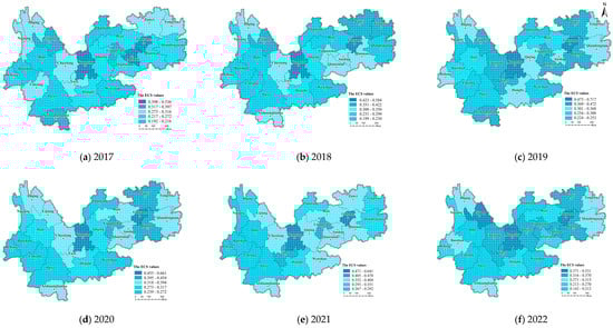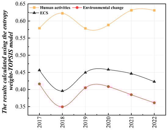 Figure 5 reflects the temporal evolution of the ECS subsystem from 2017 to 2022. During this period, YGR’s ECS shows an “M” shaped fluctuating downward trend, declining from 0.456 to 0.423. Comparing this with Figure 3, ECS exhibits a declining trend alongside the increases in MDU in 2019 and 2021, indicating that the development of MDU in the YGR has a significant negative impact on ECS. The MDU model, characterized by demographic urbanization and economic urbanization, has significantly elevated the levels of human social and economic activities in the YGR, leading to increased emissions of pollutants such as PM2.5 and SO2 [44]. Consequently, the impact of human activities on ECS has increased from 0.579 to 0.631. Although social and spatial urbanization is currently on a downward trend, further development in population and economy will increase the demand for land use and various facilities, driving urban spatial expansion and infrastructure growth. Therefore, urban planning in the YGR needs to pay more attention to the scientific and rational development of cities, particularly considering the impact of MDU on the karst ecological environment. Environmental changes have significantly decreased from 0.416 to 0.361, reflecting YGR’s long-term efforts in combating land desertification.