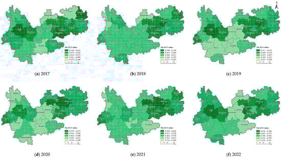 Trend in the spatial evolution of ECS level in Yunnan–Guizhou region from 2017 to 2022.