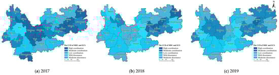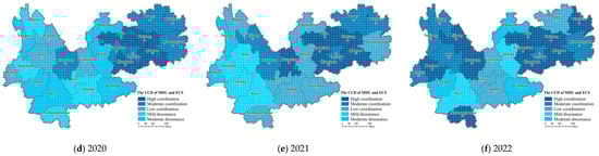 (3) Based on the increased CCD of MDU and ECS to 0.579, which reached the level of moderate coordination, the disparities in CCD between cities have significantly decreased. This improvement can be attributed to adjustments in regional policies, optimization of resource allocation, and enhanced ecological environment management. Spatially, the CCD has gradually evolved into a tri-cluster pattern of “high–low–high” across the “eastern–central–northwestern” regions.