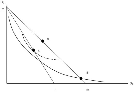 In Equations (31) and (32), the terms and are the Slutsky substitution effects of the price changes on the consumption of energy and power, for example, when the income effect of the price change has been compensated. In general, we expect own price and complementary price Slutsky effects to be negative so that the net effect is to reduce the welfare loss to the behavioral agent of a rise in price. A full derivation of these results is described in the work of Farhi and Gabaix [], but an intuitive explanation can be given by thinking of a consumer’s two-dimensional convex indifference curve diagram for true or experienced utility, as illustrated in Figure 1. The rational agent is located at A at the tangency of an indifference curve with the budget constraint line, , thereby fulfilling all the first-order conditions for a constrained utility maximum. The behavioral agent is located at an intersection of the budget line and a convex experienced utility indifference curve rather than at a tangency, fulfilling only the budget constraint condition, so that they display the overconsumption of one of the commodities. For example, the behavioral agent may be located at B on the budget constraint , where there is an overconsumption of commodity . If the price of this commodity rises so that the budget constraint pivots inwards to , the behavioral agent will likely substitute away from the commodity by reducing overconsumption, locating at a point C further along the new budget line, closer to the rational agent optimum. But this represents a higher level of experienced utility shown by the dashed indifference curve through C, since the previous allocation was at a more extreme intersection of the budget line and the convex indifference curve. Clearly, the extent to which the behavioral agent can move to a higher experienced utility indifference curve as a result of the price rise reflects the substitution effect in the demand function and, hence, this enters the amended Roy’s identity for the welfare effects of a price change for the behavioral agent. Thus, a price rise for energy or power demand will include a positive offset on the welfare of behavioral agents because they are incentivized to be located closer to the rational agent’s optimum, i.e., to bring their consumption closer to the efficient frontier. The results shown later in this paper will be related to these comparative static effects shown in Figure 1.