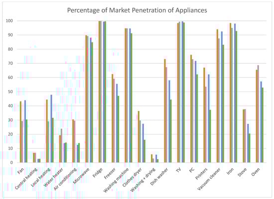The surveys are analyzed in much greater detail and the trends are discussed in Boucinha et al. []. The data on the market penetration of the appliance types are shown in Table 5 and graphically illustrated in Figure 2. We show the market penetration scores from two sources: the samples used for the data and the population average estimated by EDP SU. We see, for example, that the market penetration of central heating is higher amongst the sample responses than in the population at large; the same is true for several other appliance types, suggesting the sample data reflects consumers who are slightly more electricity-intensive users than the population as a whole.
