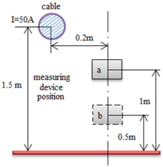 The measured magnetic field had as its source an ACSR 300/69 cable supplied with a current of 50 A and a 50 Hz frequency. The standard test setup that was used to record the magnetic field is shown in Figure 1, where a and b represent the positions of the measuring instrument—facing the ground.