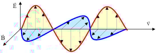 The tangential components of the electric field establish identical variation trigonometrically out of phase by 90 degrees compared to those of the magnetic field. The time-varying electric and magnetic fields are interdependent fields, which condition simultaneously (Figure 2), their variation over time generating electromagnetic waves, which propagate according to the same propagation law—Maxwell’s equations [].