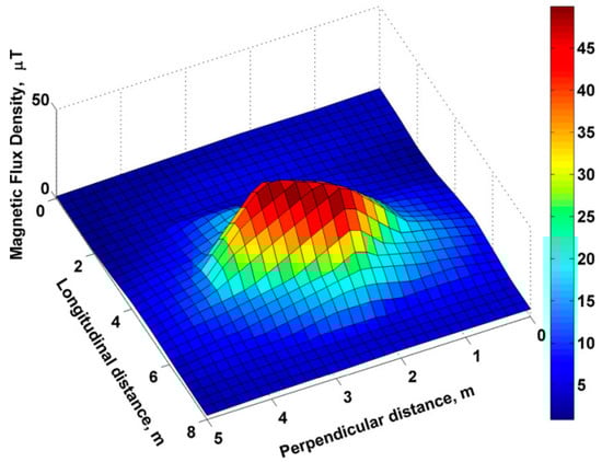 In the above figure, the relatively low variation of the magnetic field intensity level can be seen. As reported in Tesla, the magnetic induction value is 16.11 µT. The relationship between the field strength H (A/m) and flux density B(T) determines a conversion factor of 0.796 and 1.257 × 10−6 (µ0).