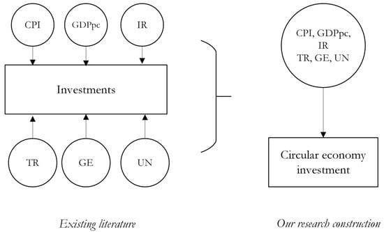 Choosing macroeconomic determinants for investment analysis includes understanding its impact on investments, regardless of the sector in which the investment is made. When selecting macroeconomic determinants for investment, it is crucial to determine how they influence these investments and understand how the monetary policy and how regulatory bodies react to certain macroeconomic developments. In the existing literature, it is most common for authors to consider separately the influence of one determinant on the investor’s investment decision. In the literature studies that addresses investments in a circular economy, authors have considered environmental determinants of these investments, like CO2 emission, air pollution, climate changes, waste management, and material footprint []. Considering the financial point of view, macroeconomic determinants are essential for attracting investors in any industry. The aim of this research is to determine whether the considered macroeconomic determinants also have the same effect on circular economy investments, without the intention to equate investments and investments in the circular economy. Therefore, our conceptual framework for selecting the macroeconomic determinants is the following Figure 1: