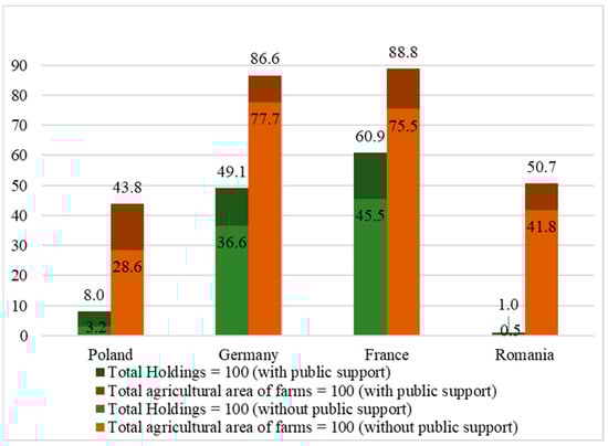 Figure 2 below shows the share of farms that can use PA and be profitable with and without public support for the minimum value of investment of EUR 35,941. The figure indicates clearly that more farms (total holdings and agricultural areas) in Poland, Germany, France, and Romania will be covered by PA with subsidies. The importance of public support cannot be over-emphasized because there is a significant increase in the share of farms in the total number of farms that can implement PA with public support (subsidies).