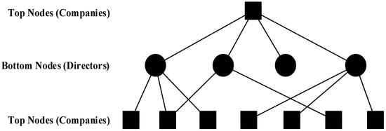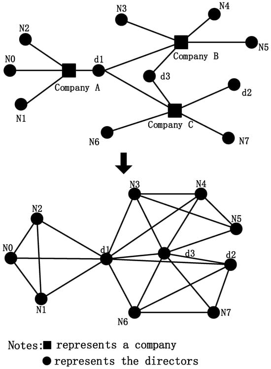 Previous studies usually employ the projection technique of social network analysis to convert the two-dimensional matrix of “company–director” into a one-dimensional matrix of “director–director” (1 if a director and b director serve on the board of directors of at least one company at the same time, and 0 otherwise) and then calculate the network centrality index at the individual director level of the sample company. The mean, maximum, or minimum value of the network characteristic variable for all directors of the company is used to reflect the director network position at the company level. However, using projection techniques to convert a two-mode model into a one-mode model (as shown in Figure 2) will cause the number of edge sets E G to expand, making the director network information redundant. Newman et al. [46] and Guillaume and Latapy [47] show that projecting onto a bipartite graph leads to very dense networks and extremely high clustering coefficients.