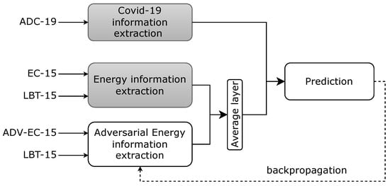 : (i) extraction of COVID-19 information; (ii) extraction of energy information; and (iii) extraction of adversarial energy information. Then, the outputs of the branches (ii) and (iii) are combined by average operation before concatenating the output of the branch (i) and forwarding to the prediction stage. Subsequently, the outputs from branches (ii) and (iii) are combined via an averaging operation before being concatenated with the output of branch (i) and subsequently fed into the prediction phase. In addition, we employ pre-trained models, including M-LSTM, long short-term memory (LSTM), bidirectional long short-term memory (Bi-LSTM), and Linear Regression (LR) models, which were originally presented in the research of Tan et al. [
