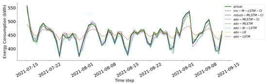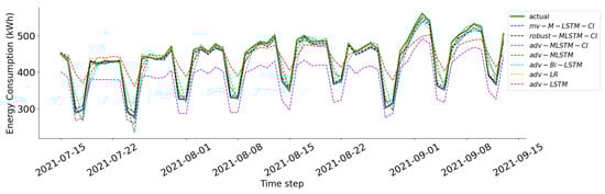20]. We apply adversarial training, a common technique that involves the direct inclusion of adversarial examples in the training dataset and the fine-tuning of these pre-trained models. Subsequently, they are called adv-M-LSTM, adv-LSTM, adv-Bi-LSTM, and adv-LR. The experiment is carried out on three datasets on three commercial buildings with three common metrics: mean percentage absolute error (MAPE), normalized root mean squared error (NRMSE), and R-squared (