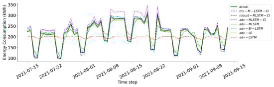adv-LR: This model is obtained from the LR model through adversarial training. LR is employed to establish relationships between historical energy consumption and future consumption. This model is simple and effective when there is a linear relationship between variables. In the adversarial generation, the average noise levels for 1, 2, and 3 are 0.99 , 1.33 , and 0.50 , respectively.