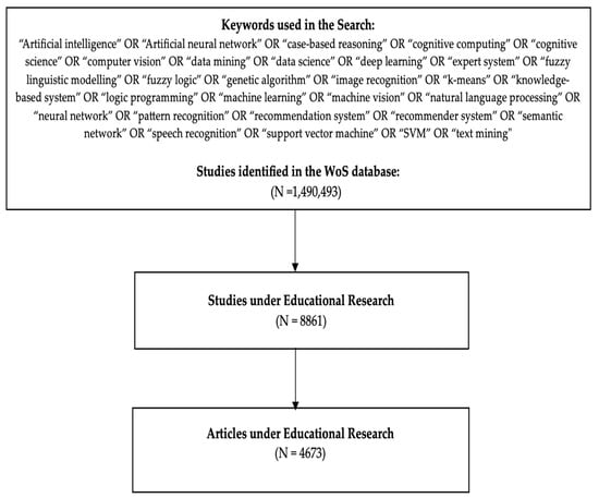 As discussed in previous studies, different subject categorizations are offered by the Scopus database (e.g., social science, computer science, decision sciences) [] and the WoS database (e.g., computer science, information systems, multidisciplinary sciences) [,]. In Scopus, computer science is a single category, but the WoS database offers a more detailed classification by dividing computer science into seven categories: computer science artificial intelligence, computer science information systems, computer science theory methods, computer science interdisciplinary applications, computer science software engineering, computer science hardware architecture, and computer science cybernetics. The Scopus database has a category for social sciences, but education is not a sub-category in the Scopus database. The WoS database enabled us to limit our search to specific categories related to education. In addition, searching the WoS database allows researchers to access sophisticated search [] and categorization [,] capabilities. After searching keywords presented in Figure 1 in the WoS database, we included studies under the educational research category, which cover papers on theoretical and practical educational issues. Under educational research, we involved peer-reviewed articles. The search on WoS was performed in September 2023 and 4673 articles were included.