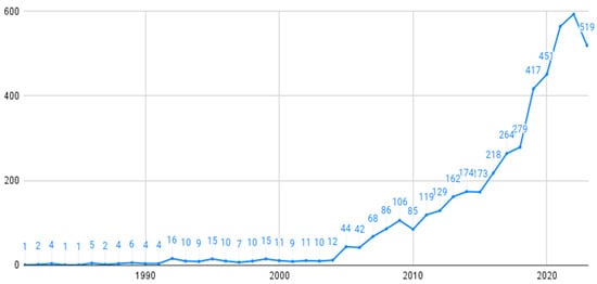 Earlier studies predominantly examined artificial intelligence in areas like learning foreign languages. In one of these studies, 41 papers from 2017 to 2023 on using artificial intelligence in language instruction were examined. The authors stated the need for additional empirical research to assess artificial intelligence’s impact on language acquisition []. Another study conducting a bibliometric and content analysis of 606 artificial intelligence studies on language acquisition published between 2017 and 2023 revealed a continuous increase in publications through 2022 []. A bibliometric examination of 185 studies on artificial intelligence in second language acquisition published between 1995 and 2022 also discussed the potential of AI applications to deliver tailored language learning [].