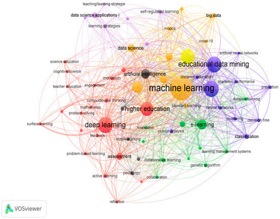 In our study, 10,486 keywords were found. Sixty-five keywords occurred more than 25 times. These keywords were placed in seven different clusters in our analysis. The top ten keywords in Figure 3 were machine learning (occurrence = 430, link strength = 905), deep learning (occurrence = 248, link strength = 475), data mining (occurrence = 245, link strength = 457), educational data mining (occurrence = 243, link strength = 564), learning analytics (occurrence = 221, link strength = 558), higher education (occurrence = 202, link strength = 564), natural language processing (occurrence = 161, link strength = 312), e-learning (occurrence = 132, link strength = 307), artificial intelligence (occurrence = 119, link strength = 290), and data science (occurrence = 98, link strength = 260).