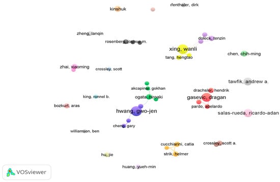 In Figure 4, we included 41 authors who had seven or more publications. These authors were grouped into 22 different clusters. There were 13 authors placed individually in a cluster, demonstrating the lack of strong connections among top authors. There were only two clusters presenting a connection among four different authors. Gwo-Jen Hwang is in the blue cluster together with Gary Cheng, Haoran Xie, and Checgjiu Yin. The green cluster includes Gokhan Akcapinar, Hiroaki Ogata, Solomon Sunda Oyelere, and Stephen J. H. Yang. Hiroaki Ogata is among the top ten authors in Table 3. The author with the second-most articles (Wanli Xing) is in the yellow cluster with Bo Pei and Hengtao Tang. The author with the third most articles (Dragan Gasevic) is in the red cluster together with Hendrik Drachsler, Jelena Jovanovic, and Abelardo Pardo.
