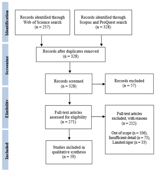 The methodological framework applied in this systematic review is the Preferred Reporting Items for Systematic Reviews and Meta-analysis (PRISMA), and with its web-based Shiny app flow design, the search outcomes and screening procedures were integrated (Figure 1). A quantitative literature review was performed in June 2024 across ProQuest, Scopus, and the Web of Science with these search terms: “smart cities” + “sustainability” + “artificial intelligence” for published original and review research, between 2018 and 2024, with 59 final sources remaining for analysis. We selected only original articles and reviews published in English, considering the top 20 most-cited papers covering the debated topics (Table 1).