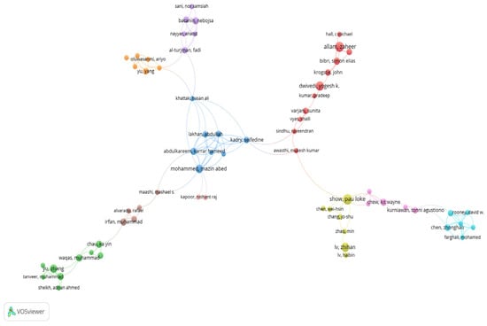 VOSviewer mapping of artificial intelligence technologies in sustainable smart city administration: Internet of Things big data analytics, sensor-based digital twin urban computing vision algorithms, and blockchain cloud networks regarding co-authorship. (see Table 2 for VOSviewer clusters).