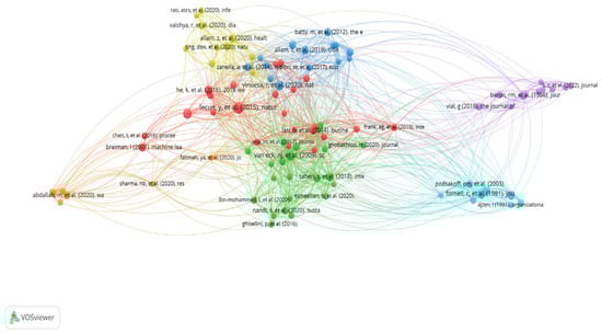 VOSviewer mapping of artificial intelligence technologies in sustainable smart city administration: Internet of Things big data analytics, sensor-based digital twin urban computing vision algorithms, and blockchain cloud networks regarding co-citation. (see Table 5 for VOSviewer clusters).
