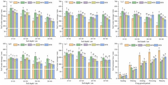 Characteristics of soil water migration and diffusion. (a) Water storage at the seedling stage, (b) tillering water storage, (c) water storage at the jointing stage, (d) water storage during the pumping period, (e) water storage at maturity, and (f) soil water loss at different growth stages. In addition, a, b, ab, bc and c indicate that the parameters are significantly different under the same treatment (p < 0.05). BL, BC, LFB, MFB and HFB represent the treatments set up in the research.