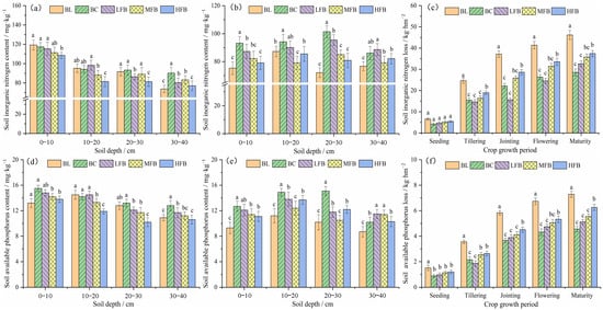 Migration characteristics of nitrogen and phosphorus in soil. (a) Soil inorganic nitrogen at the seedling stage, (b) soil inorganic nitrogen at maturity, (c) soil inorganic nitrogen loss, (d) available soil phosphorus at the seedling stage, (e) available soil phosphorus at maturity, and (f) available soil phosphorus loss. In addition, a, b, ab, bc and c indicate that the parameters are significantly different under the same treatment (p < 0.05). BL, BC, LFB, MFB and HFB represent the treatments set up in the research.