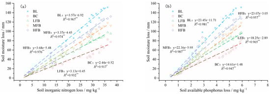 There was a significant correlation between the soil water and nutrient loss processes (Figure 3). In the BL treatment, the slope of the fitting line for soil water loss and inorganic nitrogen loss was 3.57, whereas in the BC treatment, the slope of the scatter point fitting curve was lower than that in the BL treatment, indicating that soil inorganic nitrogen content decreased under the driving effect of soil water loss per unit. In addition, the slopes of the fitting curves of soil water and nutrient loss under the LFB, MFB, and HFB treatments showed varying degrees of decline compared with the BL treatment. The findings of this study are consistent with the views proposed by Zheng et al. [] that biochar can improve soil field water capacity and microbial nitrogen fixation and contribute to reducing nitrogen loss.