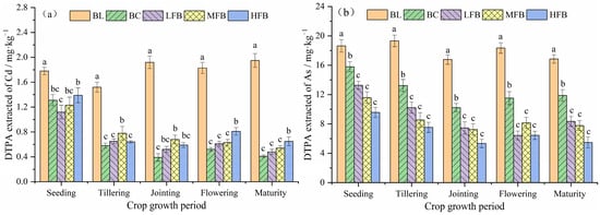 The amounts of extractable Cd and As from DTPA in the soil (used as an approximation of its bioavailability) were significantly reduced by the addition of the modifier (Figure 4). A one-way analysis of variance was used (p < 0.05) to analyze the significant differences in metals extracted by DTPA under different treatments at different periods. During the jointing period, the DTPA extraction concentration of Cd in soil under the BL treatment was 1.52 mg∙kg−1, while that under the BC, LFB, MFB, and HFB treatments was reduced by 79.68%, 72.92%, 64.58%, and 69.27%, respectively, compared with the BL treatment. This is because biochar contains a variety of functional groups, such as hydroxyl, carboxyl, and carbonyl groups, which directly immobilize Cd through surface complexation and immobilization []. In addition, the alkalinity of biochar indirectly reduces metal dissociation through electrostatic attraction because more negative charges are attached to the surface of the soil particles [,,].