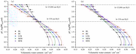 The fitting results of soil water characteristic parameters showed that the θs value of soil increased by 18.25%, 13.24%, 7.75%, and 5.99% in the BC, LFB, MFB, and HFB treatments, respectively, compared with the BL group, while the θr value of soil showed an opposite trend. As mentioned above, biochar improves soil water retention owing to an increase in total soil porosity and a change in the distribution of aggregates, thus increasing the water storage capacity of soil pores [,]. In addition, by comparing the difference in soil water storage in the high suction and low suction stages under different treatment conditions, we also found that the soil water storage capacity in different suction stages under the BC treatment was the largest, which further confirmed that the biochar–soil system affected particle accumulation and changed the mesoporous volume of soil. It also increased the availability of soil water [,]. Zhang et al. [] found that the carbon-based materials improved soil water retention to varying degrees, and the effect was significant with an increase in biochar content.
