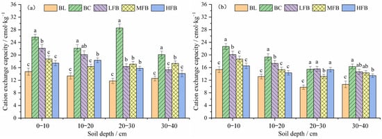 Soil cation exchange capacity. (a) Soil cation exchange capacity at the seedling stage and (b) soil cation exchange capacity at maturity. In addition, a, b, ab and c indicate that the parameters are significantly different under the same treatment (p < 0.05). BL, BC, LFB, MFB and HFB represent the treatments set up in the research.