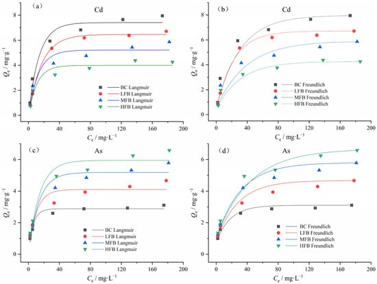 The adsorption isotherms of Cd and As at different concentrations of biochar and modified biochar are shown in Figure 7. The adsorption capacities for Cd and As increased with increasing mass concentrations of the equilibrium solution. When the equilibrium liquid concentration is low, the adsorption capacity increases rapidly with increasing mass concentration; when the equilibrium liquid mass concentration reaches a certain threshold value, the adsorption capacity increases slowly and finally reaches equilibrium []. This is because, under certain conditions, the soil adsorption sites for Cd and As are fixed. With an increase in metal concentration, the adsorption capacity also increases while the number of adsorption sites gradually decreases, and the adsorption capacity of the soil for metals decreases [,]. For Cd, the adsorption capacity of the original biochar was higher than that of the modified biochars (LFB, MFB, and HFB), whereas the adsorption capacity of the modified biochar was better than that of the original biochar.