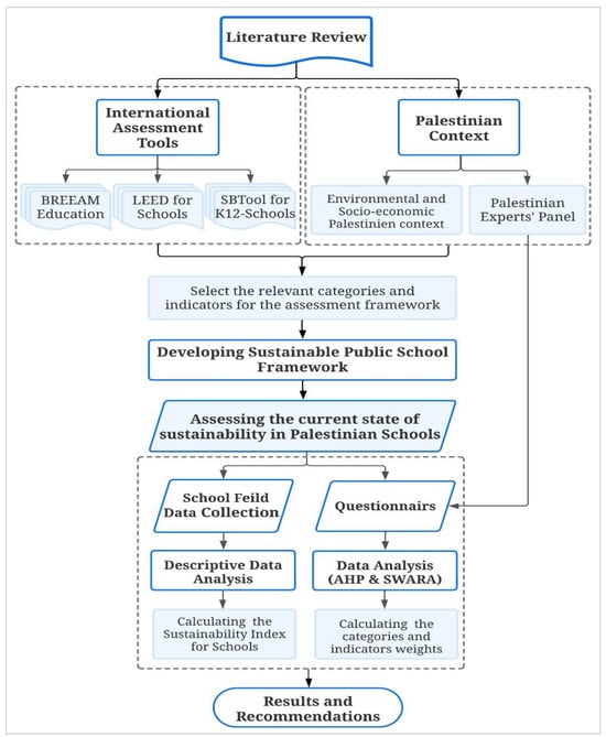 Several studies have proposed tools for assessing school building sustainability considering specific regional contexts. Ref. [] focused on implementing sustainability in school buildings in Iraq. They used a combination of BREEAM, LEED, PBRS, AlSa’fat, SBTool, and expert opinions. Although the study primarily assessed environmental sustainability in school buildings, it did not consider the social and economic indicators. Ref. [] adapted the SBTool methodology to determine the sustainability of secondary school buildings in Portugal. Their study included LEED for Schools, BREEAM Education, and SBTool. This research represents the initial sustainability assessment of Portuguese school construction, focusing on the adaptability of SBTool to evaluate basic education institutions. Ref. [] sought to develop guidelines for assessing school sustainability in Egypt, using the Eco-Schools Program in Cyprus and Canada, the Green Schools Program in Ireland, and LEED for Schools. This study represents the first evaluation of the sustainability of Egyptian schools. Notably, it applied the same framework to both new and existing schools, raising concerns about effectiveness due to different indicators between these two cases. In Palestine, this kind of sustainability framework and analysis is absent.