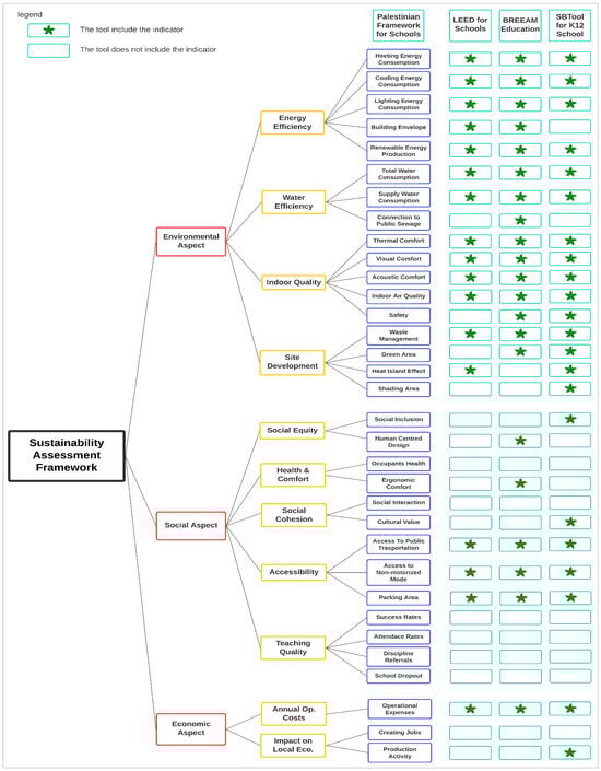 In summary, the proposed framework for school sustainability assessment in Palestine is characterized by its holistic environmental, social, and economic coverage. This framework is compatible with existing international tools that consider the specific needs and challenges of schools in Palestine, thus promoting sustainable development in the education sector.