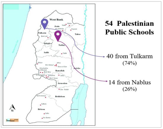 The questionnaire was conducted with school administrators because they comprehensively understand the school’s operations and policies. They provide general information about the school, socioeconomic issues, and environmental characteristics. Schools from the Tulkarm and Nablus governorates in the West Bank were selected for the application. This selection is due to the possibility of obtaining information and data from the Directorate of Education and Schools. Tulkarm governorate is in the northwestern part of the West Bank and borders the Mediterranean Sea to the west. Nablus Governorate is in the northern part of the West Bank. The region is characterized by rugged mountains, including Mount Gerizim and Mount Ebal, deep valleys, and fertile plains. Nablus is known for its historical and architectural heritage, including the well-preserved Old City with its traditional markets, narrow streets, and historic buildings. By including schools from Tulkarm and Nablus, we were able to cover both social and geographic diversity.
