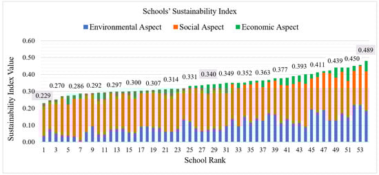 Figure 5 shows the sustainability index values obtained from the sample of Palestinian schools. These values range from a minimum of 0.229 to a maximum of 0.479, with a mean value of 0.343. These values indicate the extent to which schools in Palestine adopt sustainable practices, with higher index values indicating higher levels of sustainability. We notice a difference in sustainability performance between schools, but generally, sustainability is very low, at less than 50%. At the same time, it is better than the worst value, which is 0. This shows that progress is being made towards sustainability, although there is still room for improvement in social, environmental, and economic aspects. Here, we notice an important aspect: The school that achieved the highest sustainability index is the school that achieved a balanced approach to the three pillars of sustainability. In contrast, this school, which ranked 7, received the highest score for social performance, while the overall performance was very low due to ignoring the environmental and economic aspects. Instead of focusing only on excellence in a specific category, all indicators should be considered satisfactorily.
