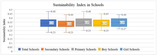 According to the results presented in Figure 6, the sustainability index for secondary schools is very close to that of primary schools (6% lower). This contradicts the concept that secondary schools, being more aware and responsible, will exhibit higher levels of sustainability. However, the reason behind this discrepancy is that social rather than environmental indicators primarily influence the sustainability of primary schools. While secondary schools show significantly lower energy and water consumption, primary schools excel in social inclusion, which is very important according to the expert opinions presented earlier. Regarding school gender, there is no noticeable difference between female and male schools regarding sustainability. This is because these schools have an apparent convergence regarding all sustainability aspects, including environmental, social, and economic.