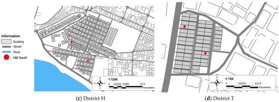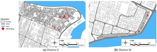 For our field survey, we selected twelve HBE dwellings located in four different districts, as shown in Figure 1. Figure 3 and Figure 4 illustrate the map and appearance of these districts. The first district is Rukun Warga (RW 13) within Kampung Sangkrah, located in Sangkrah, District of Pasar Kliwon, Surakarta (hereafter, District S). This area was selected as a typical urban informal residential district from 29 existing urban slum areas in Surakarta City. District S is notable for its high poverty rate of 30% [2331] and high population density, recorded at 16,101 people per square kilometer according to the 2024 BPS Statistics of Surakarta [45]. Figure 3a and Figure 4a display typical urban slum characteristics, with a dense aggregation of variously sized buildings and a notably irregular layout in relation to the surrounding streets.