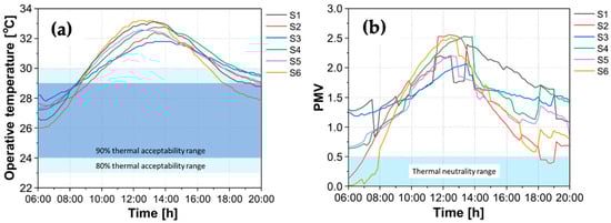 (a) Averaged daily fluctuation in operative temperature and (b) PMV at six dwellings of District S during HBE working hours.