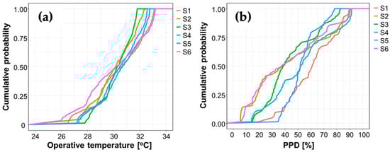 (a) Cumulative probability density distributions of operative temperatures and (b) PPD at six dwellings of District S during HBE working hours.