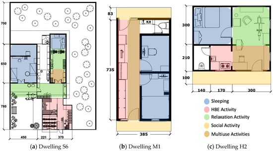Floor plans of surveyed dwellings including space use (unit: cm).